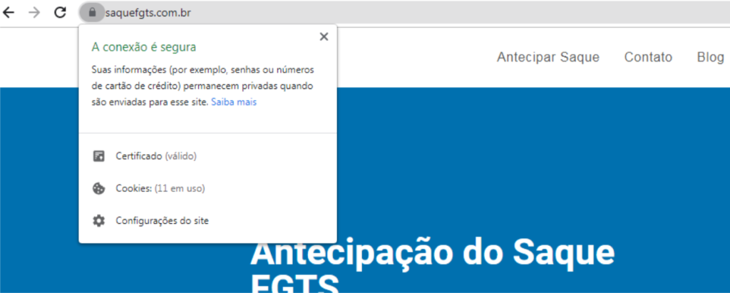 A plataforma que conta com o certificado SSL possui, antes do domínio, um cadeado verde seguido com a escrita Seguro. Essa certificação pode aparecer também por meio de imagem de cadeado que antecede o domínio que, ao ser clicado, exibe a mensagem: “a conexão é segura”. Veja exemplo abaixo.